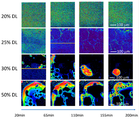 研究人员利用XRF对ASD薄膜中的相分离现象进行了原位观察,本案例中利托那韦分子中特殊的硫原子信号可以区别于几乎没有信号的聚合物。结果显示,在暴露在100%RH环境下时,载药量20%的ASD在进行观察的12小时内没有发生相分离,而载药量50%的ASD在10分钟内就发生了相分离,载药量25%和30%的ASD相分离分别在约79和52分钟可以被明显观测到。图6展示了XRF的成像结果,载药量(DL)25%和30%的实验中用橙色线标出了相分离的开始点。